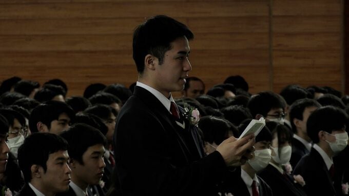 拍手に迎えられ、卒業生が入場します。おかやま山陽高校ではきょう(27日)、普通科をはじめ調理科など、5学科349人が卒業式に臨みました。それぞれの学科の代表が原田一成校長から卒業証書を受け取り、卒業生代表の尾形大翔さんが、「チャンスのあふれる高校生活を通じて挑戦と努力を続けてください」と在校生たちを激励しました。