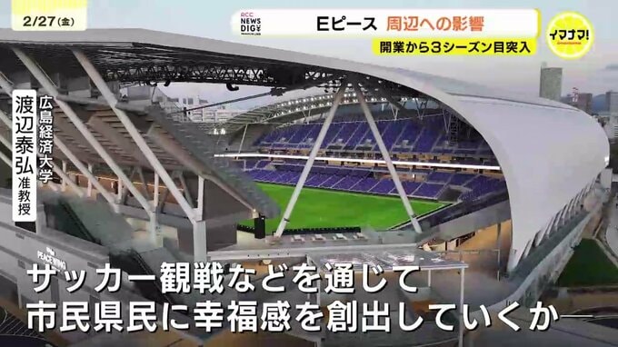 深掘りニュースディグきょうは開業から3シーズン目となりましたエディオンピースウイング広島。サンフレッチェ広島は、2025年度にホームで開催した男子・女子のリーグ戦やカップ戦などを合わせた27試合の入場者数は、クラブ史上最多の60万2944人となりました。開業から丸2年が経過しましたが、今年も多くの観客が訪れていますが、周辺地域にはどんな影響が出ているのでしょうか?