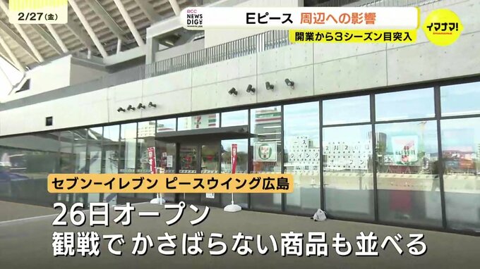 スタジアムに隣接する芝生の公園「HIROPA!」には、平日から家族連れなどが訪れています。きのうスタジアムを訪れると、この周辺では初めてコンビニエンスストアがオープンしていました。店のスタッフによると、小分けされたスナックなど観戦中でもかさばらずに食べられる商品を多めに揃えたと言うことです。開業後も機能が少しずつ増えています。