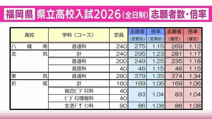 【全校掲載・確定版】福岡県立高校(北九州地区)2026年一般入試の志願者数・倍率 東筑1.34倍・小倉1.19倍・八幡1.05倍・戸畑1.15倍 RKB毎日放送 2026年2月27日(金) 20:45 国内 八幡南・北筑・東筑・折尾の志願者数と倍率