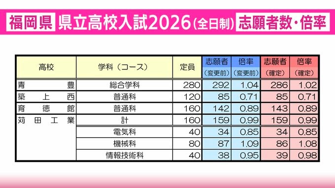 【全校掲載・確定版】福岡県立高校(北九州地区)2026年一般入試の志願者数・倍率 東筑1.34倍・小倉1.19倍・八幡1.05倍・戸畑1.15倍 RKB毎日放送 2026年2月27日(金) 20:45 国内 青豊・築上西・育徳館・苅田工業の志願者数と倍率