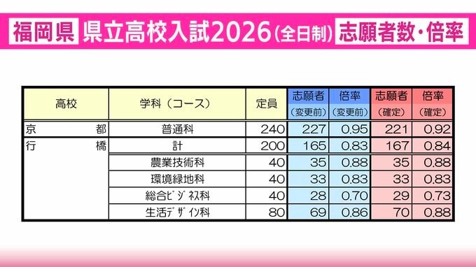 【全校掲載・確定版】福岡県立高校(北九州地区)2026年一般入試の志願者数・倍率 東筑1.34倍・小倉1.19倍・八幡1.05倍・戸畑1.15倍 RKB毎日放送 2026年2月27日(金) 20:45 国内 京都・行橋の志願者数と倍率