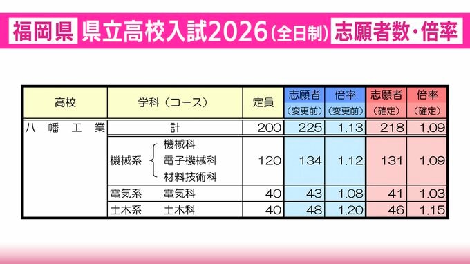 【全校掲載・確定版】福岡県立高校(北九州地区)2026年一般入試の志願者数・倍率 東筑1.34倍・小倉1.19倍・八幡1.05倍・戸畑1.15倍 RKB毎日放送 2026年2月27日(金) 20:45 国内 八幡工業の志願者数と倍率