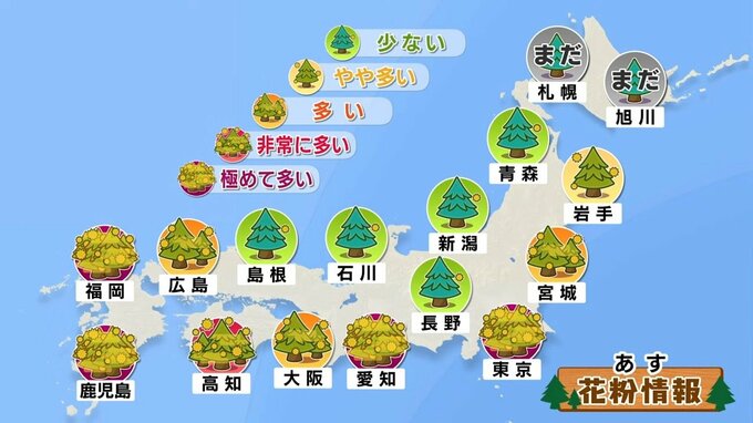 花粉に注意!東京都心は4月中旬並みの暖かさに 関東から西の太平洋側は晴れて気温上昇 一方、日本海側は雨降りやすい予想【2月28日の天気】 TBSテレビ 2026年2月27日(金) 18:55 国内 天気 花粉飛散 東京や愛知などでは“極めて多い予想” ■花粉飛散に注意を 晴れる地域を中心に、花粉が多く飛びそうです。特に、東京や愛知、福岡、鹿児島では極めて多い予想、高知も非常に多い予想です。花粉症の方はしっかりと対策を行いましょう。