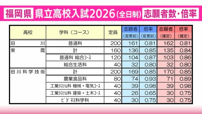 【全校掲載・確定版】福岡県立高校(筑豊地区)2026年一般入試の志願者数・倍率 嘉穂0.99倍・鞍手0.88倍・田川0.81倍・嘉穂東0.93倍 RKB毎日放送 2026年2月27日(金) 20:46 国内 田川・東鷹・田川科学技術の志願者数と倍率