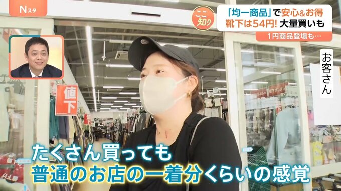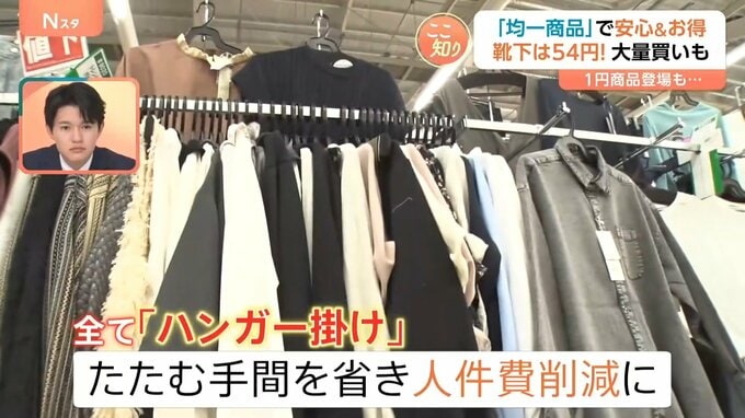 約2万5000点ある商品は全て「ハンガー掛け」。一つ一つたたむ手間を省くことで人件費が削減でき、安さに繋がっているといいます。