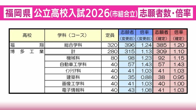 【全校掲載・確定版】福岡県公立高校(市組合立・定時制)2026年一般入試の志願者数・倍率 福翔1.20倍・福岡西陵1.08倍・古賀竟成館0.94倍 RKB毎日放送 2026年2月27日(金) 20:46 国内 福翔・博多工業の志願者数と倍率