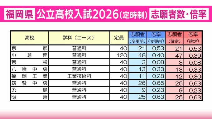 【全校掲載・確定版】福岡県公立高校(市組合立・定時制)2026年一般入試の志願者数・倍率 福翔1.20倍・福岡西陵1.08倍・古賀竟成館0.94倍 RKB毎日放送 2026年2月27日(金) 20:46 国内 定時制(京都・小倉南・若松・八幡中央・福岡工業・筑紫中央・糸島・明善)の志願者数と倍率