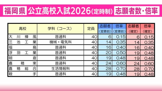 定時制(大川樟風・三池工業・福島・浮羽工業・朝倉・嘉穂東・嘉穂総合・鞍手)の志願者数と倍率
