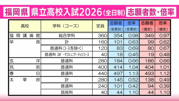 【全校掲載・確定版】福岡県立高校(福岡地区)2026年一般入試の志願者数・倍率 修猷館1.66倍・福岡1.43倍・筑紫丘1.45倍・城南1.47倍 RKB毎日放送 2026年2月27日(金) 20:46 国内 福岡講倫館・早良・玄洋・筑前・春日・太宰府の志願者数と倍率