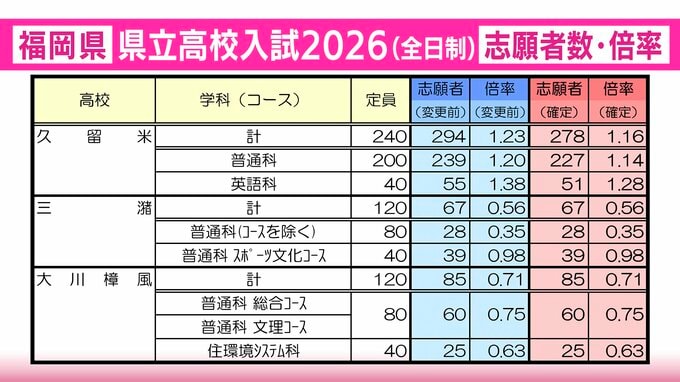 【全校掲載・確定版】福岡県立高校(筑後地区)2026年一般入試の志願者数・倍率 明善1.30倍・久留米1.16倍・伝習館1.29倍・八女1.01倍 RKB毎日放送 2026年2月27日(金) 20:46 国内 久留米・三潴・大川樟風の志願者数と倍率