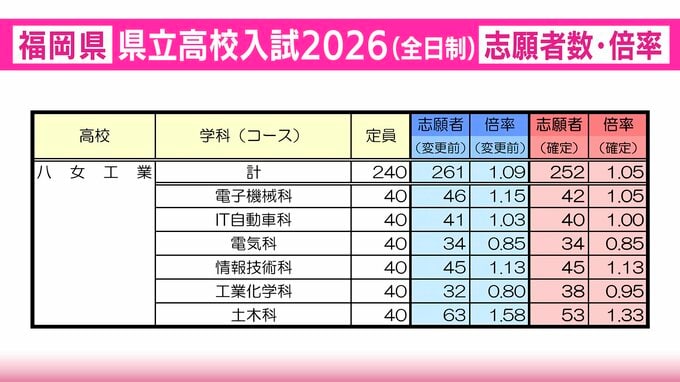 【全校掲載・確定版】福岡県立高校(筑後地区)2026年一般入試の志願者数・倍率 明善1.30倍・久留米1.16倍・伝習館1.29倍・八女1.01倍 RKB毎日放送 2026年2月27日(金) 20:46 国内 八女工業の志願者数と倍率