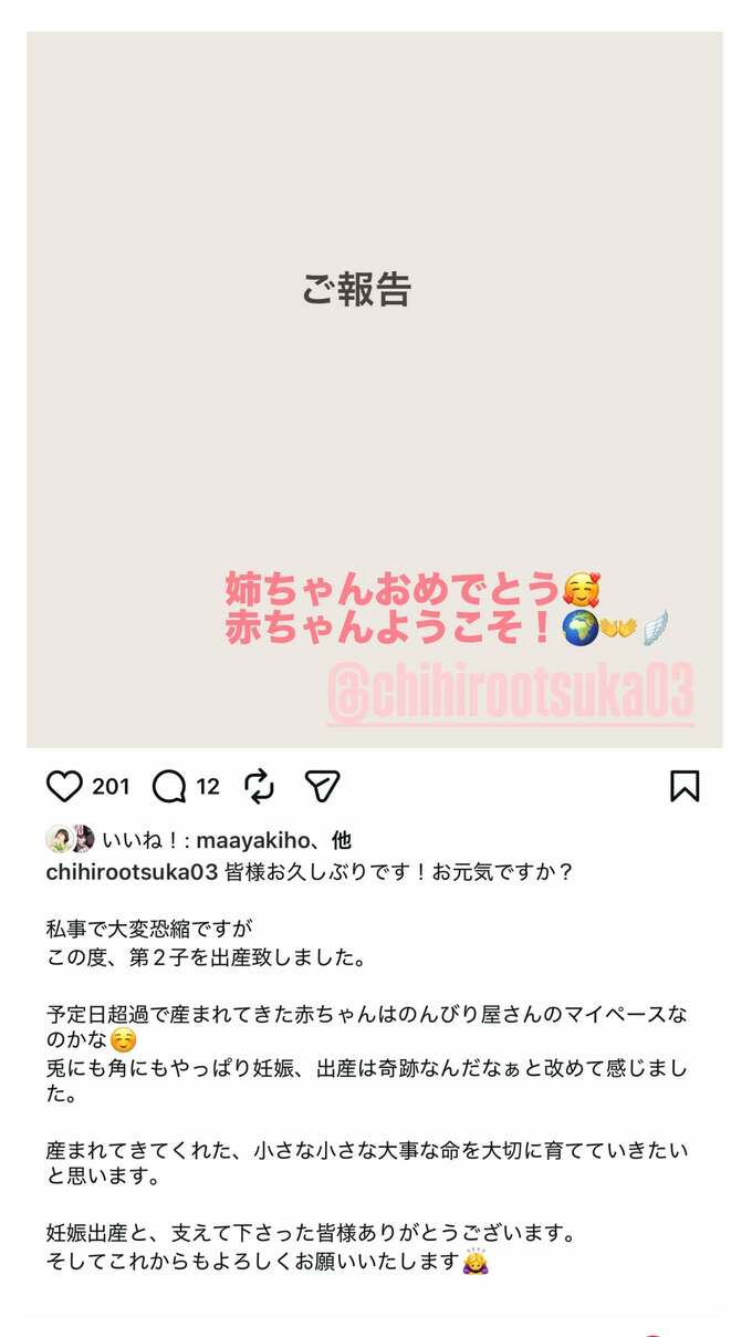 大塚さんは、シンプルに「ご報告」という文字だけの写真を投稿。テキストでは「皆様お久しぶりです!お元気ですか?」「私事で大変恐縮ですが この度、第2子を出産致しました」と、朗らかに報告しました。