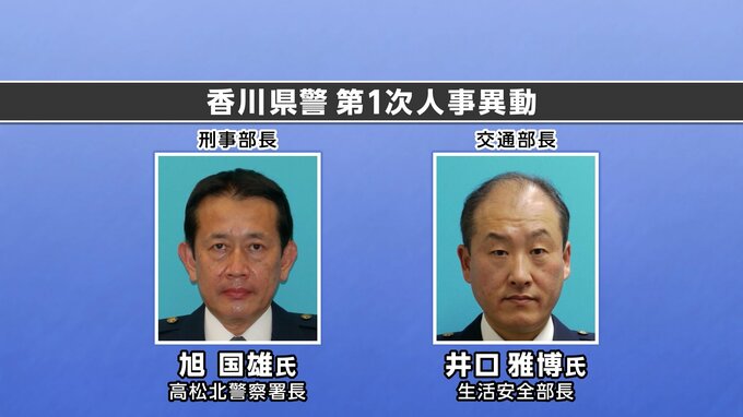 【香川県警】第1次人事異動発表 観音寺警察署長に安冨行美氏 香川県で初めて、四国で2人目の女性署長 RSK山陽放送 2026年2月28日(土) 13:00 国内 刑事部長・交通部長 新しい刑事部長には高松北警察署長の旭国雄氏が、新しい交通部長には生活安全部長の井口雅博氏が就きます。