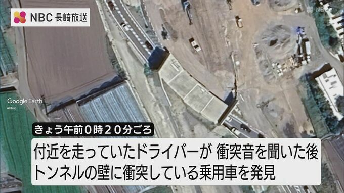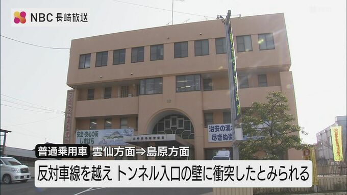 警察によりますと、雲仙方面から島原方面に向け走っていた普通乗用車が、反対車線を越えて、トンネル入口の壁に衝突したとみられるということです。