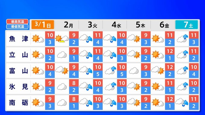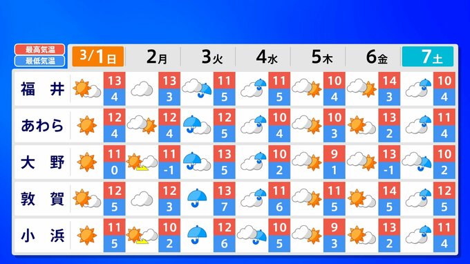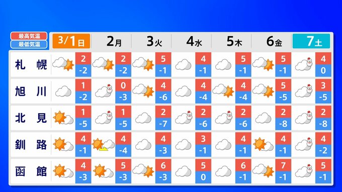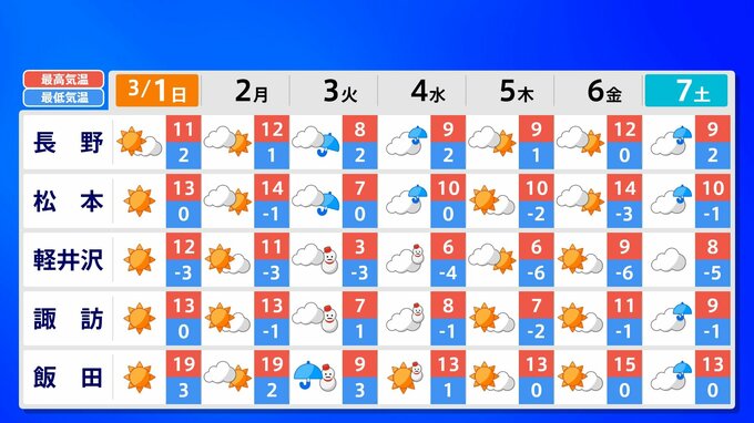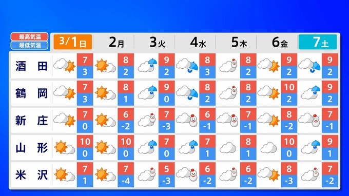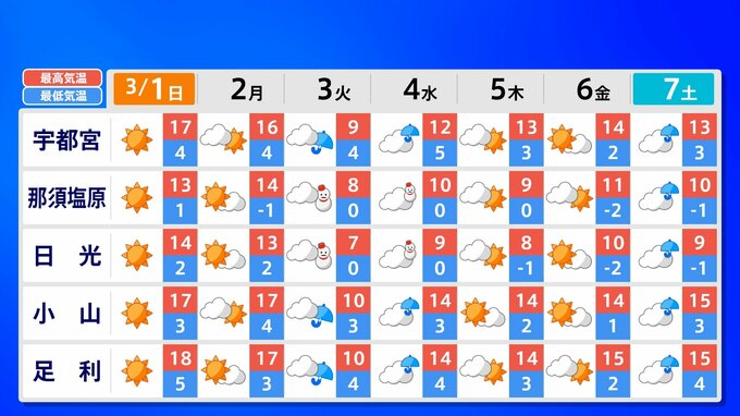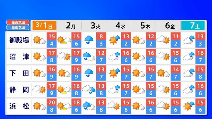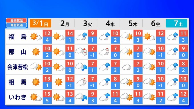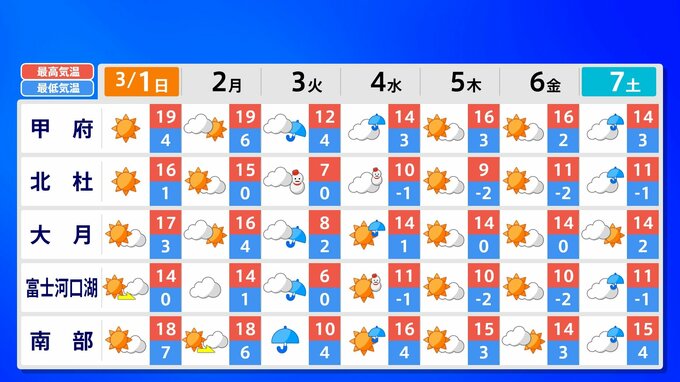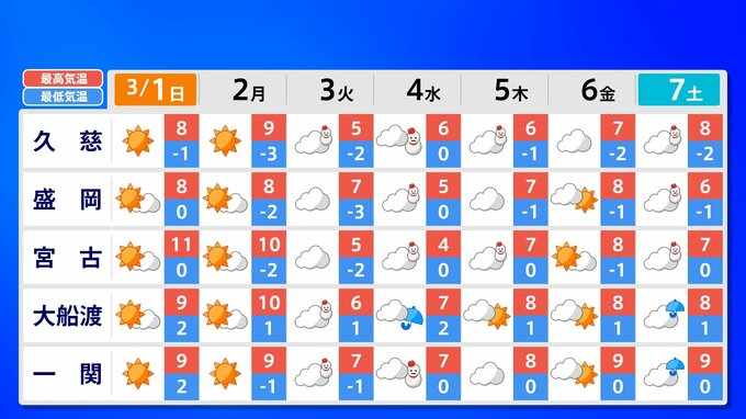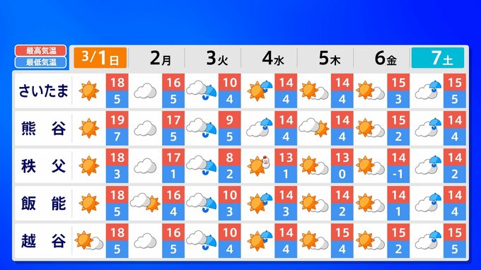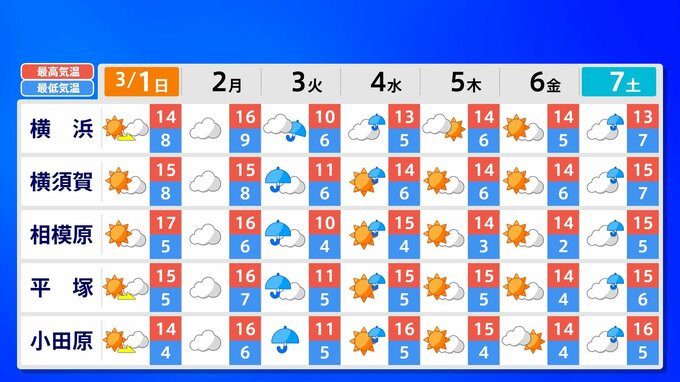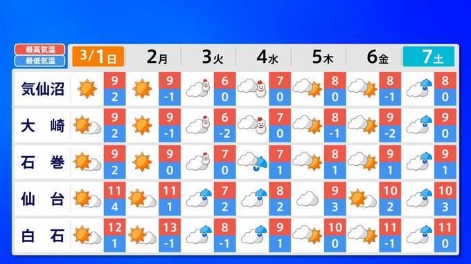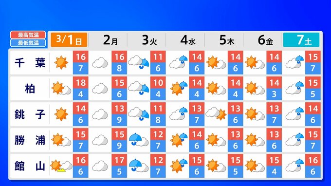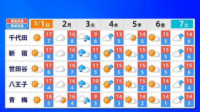 【東京マラソン 天気】予想最高気温は17℃(4月上旬並み)【メッシュ予報 / ピンポイント予報 】全国各都市の週間予報 南日本放送 2026年2月28日(土) 17:00 国内 天気 全国の週間予報(3月1日(日)~7日(土)) 各都道府県の週間予報(7日(土)まで)を画像で掲載しています(各都道府県5か所ずつ)。 3月3日(火)は「寒の戻り」で寒くなるでしょう。東京の予想最高気温は9度と、この土日に比べ10度も下がる見込みです。