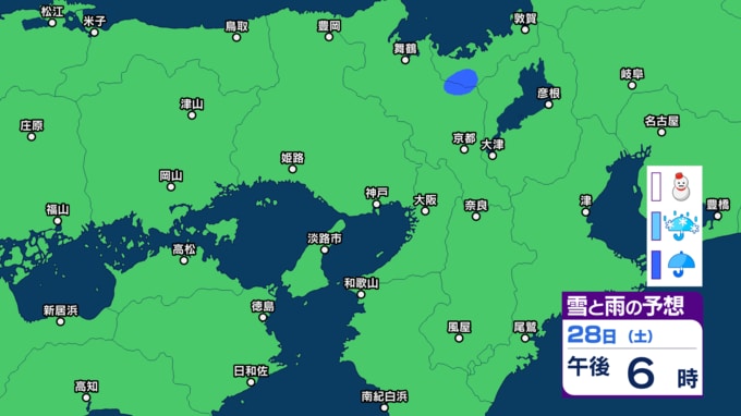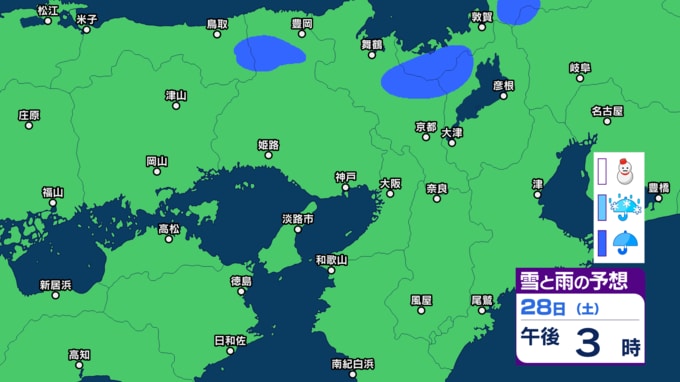 28日の近畿地方は、湿った空気や寒気の影響で曇り、北部では昼過ぎまで雨が降るでしょう。南部を中心に高気圧に覆われて晴れる見込みです。