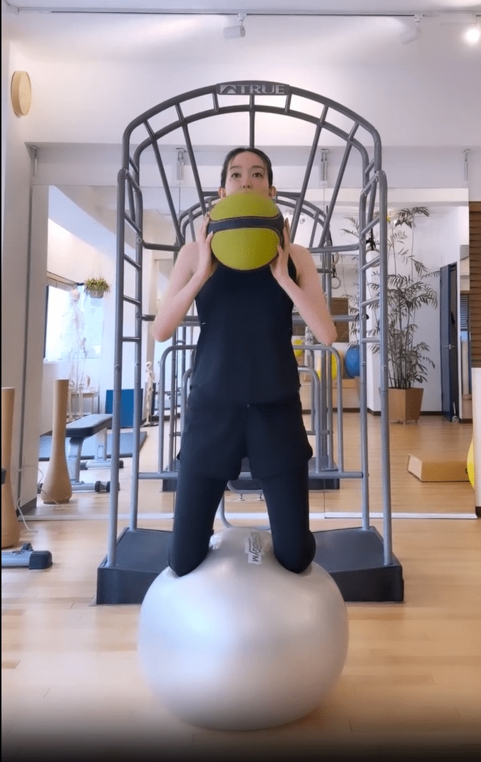 これまでもピラティスやダンベルを使ったトレーニングなど、身体づくりのためにストイックな姿を投稿していた松島さん。今回のトレーニングでは、バランスボールの上で膝立ちになり、メディシンボールを頭上に投げてはキャッチする姿を披露しています。