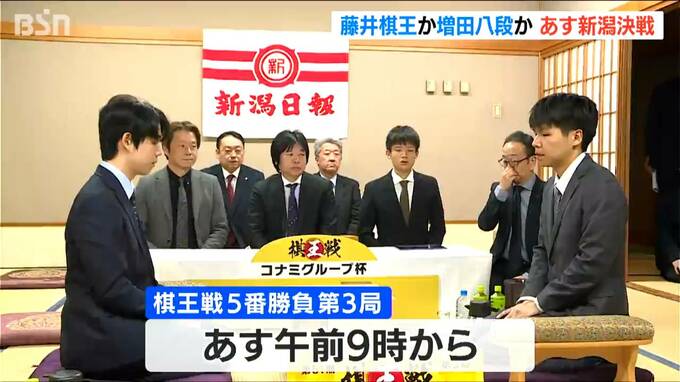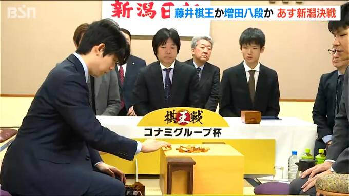 藤井聡太棋王に増田康宏八段が挑む棋王戦5番勝負第3局が3月1日、新潟市中央区の新潟グランドホテルで行われます。28日は両者が検分に臨みました。