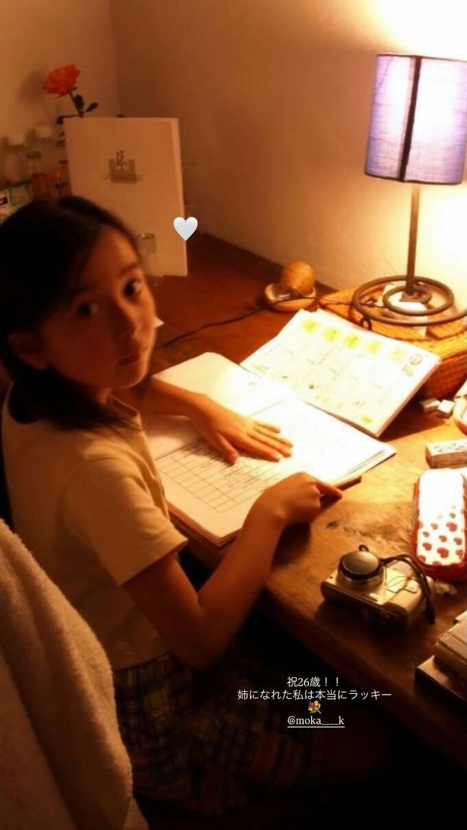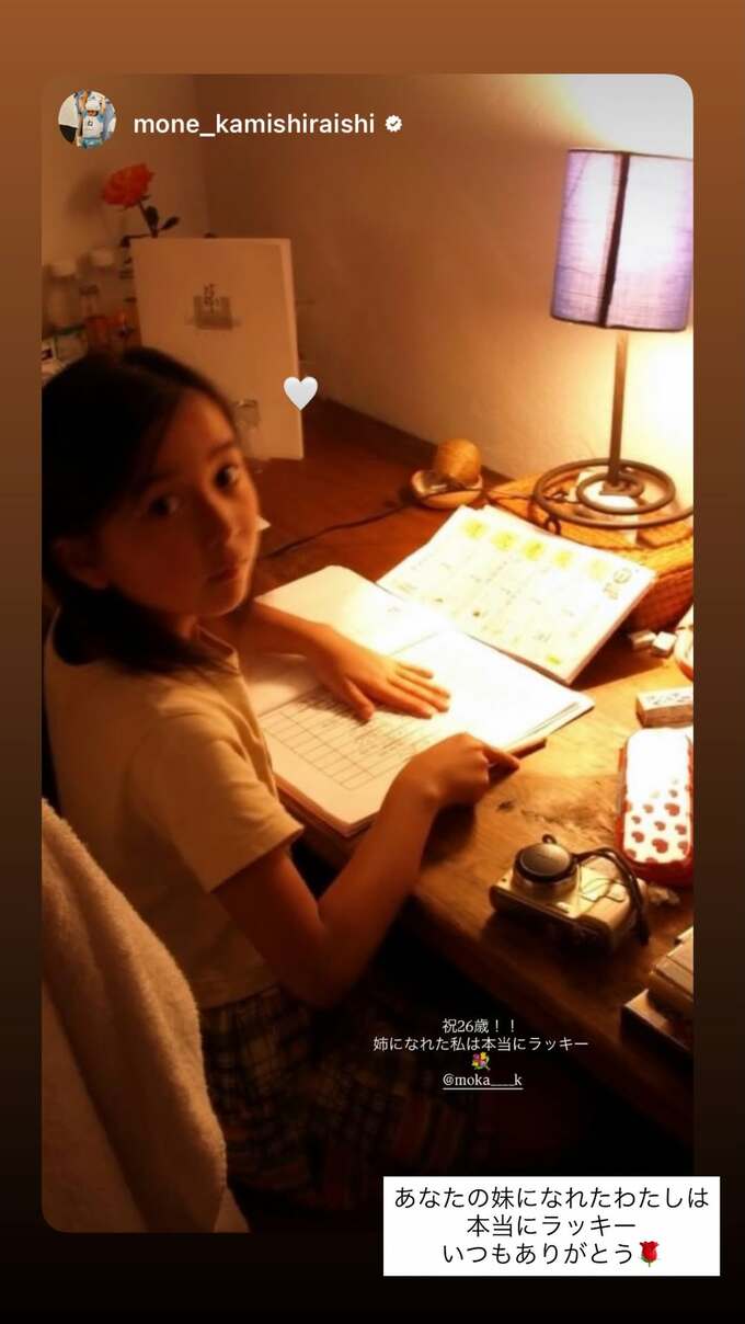 萌音さんは、小さい頃の萌歌さんがデスクで勉強しつつこちらを振り返っている写真をストーリーズに投稿。萌歌さんの顔のそばにハートマークを追加して、「祝26歳!!」「姉になれた私は本当にラッキー」と花束の絵文字を添えて、萌歌さんに宛てたメッセージを投稿しています。