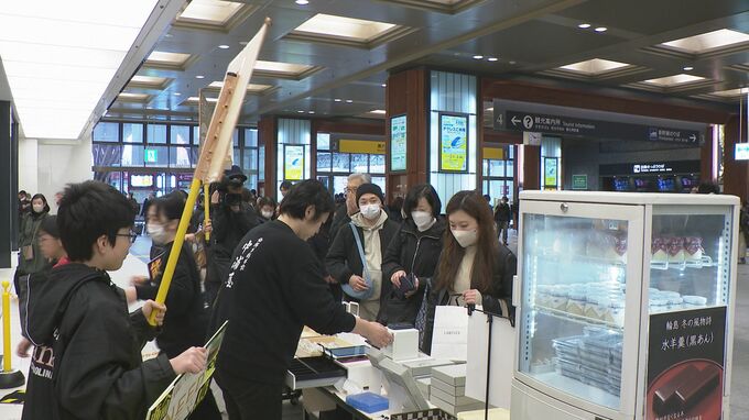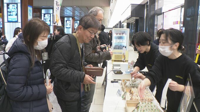 2026年春統合される、石川県輪島市内6つの小学校の子どもたちが28日、金沢駅で地元食材を使った和菓子を販売し能登の魅力を呼びかけました。