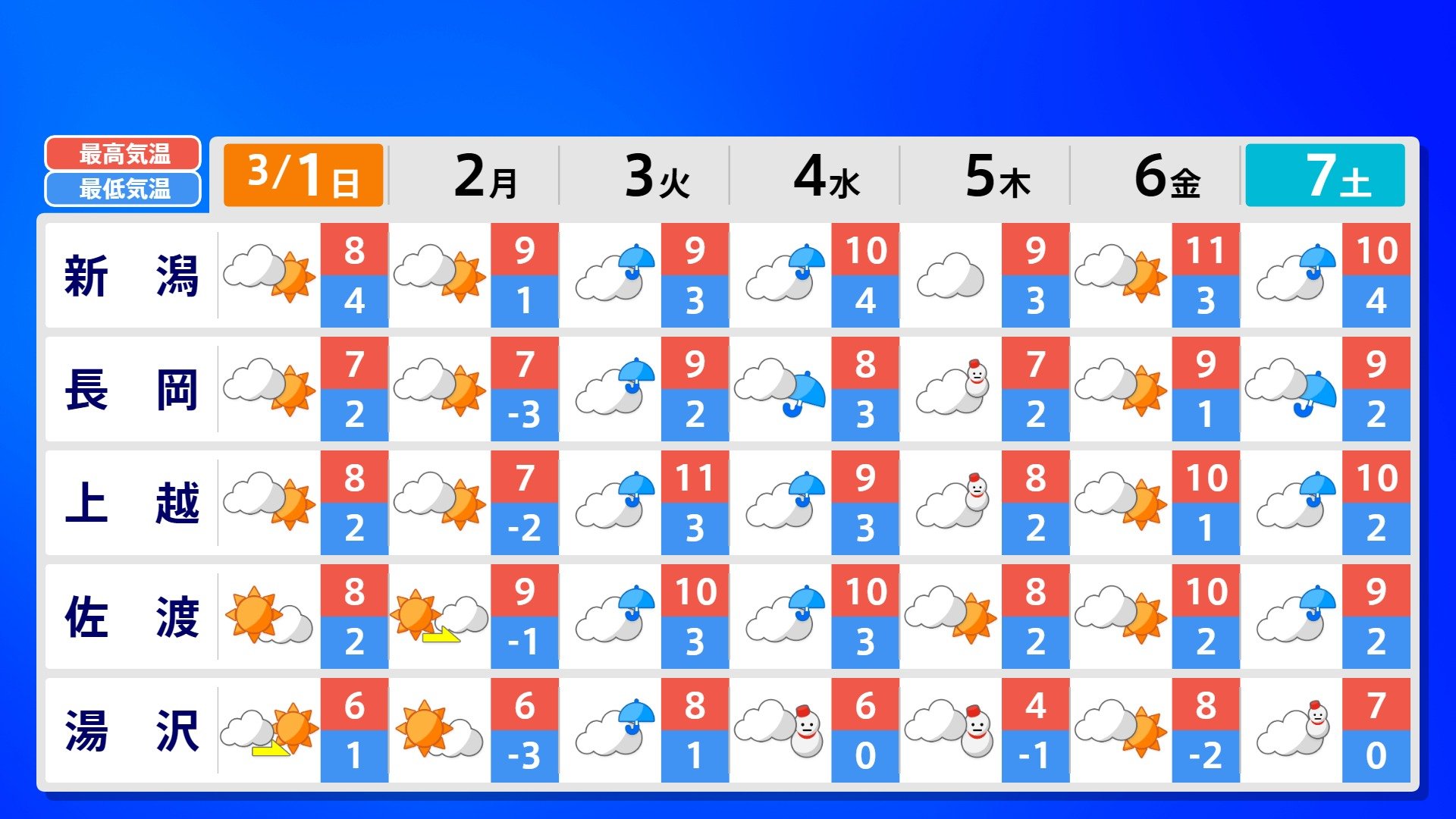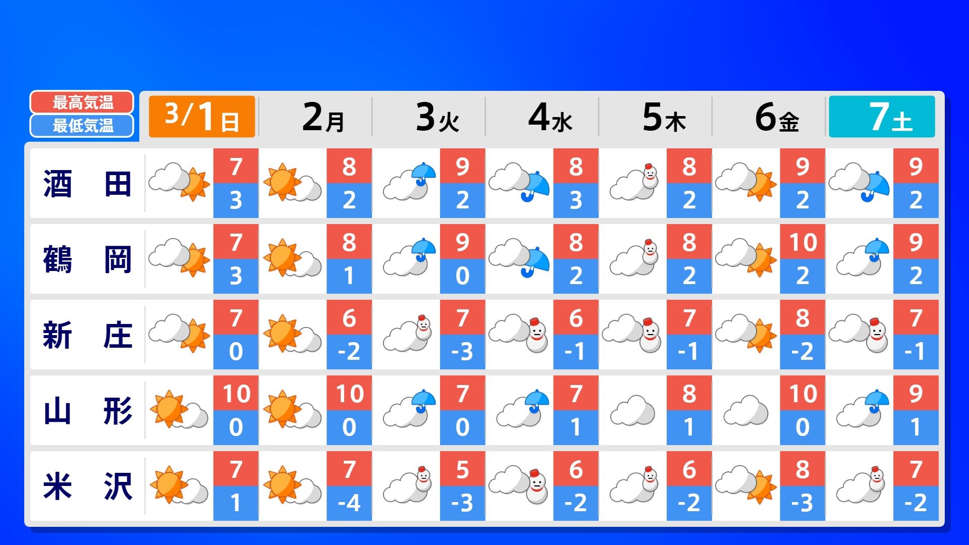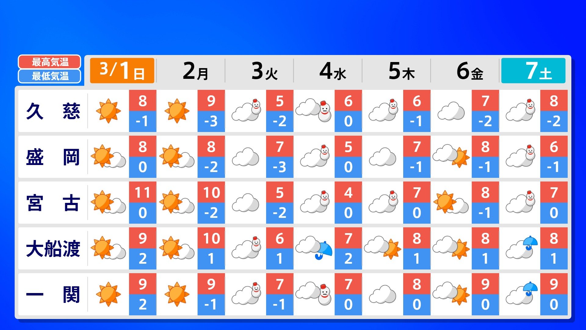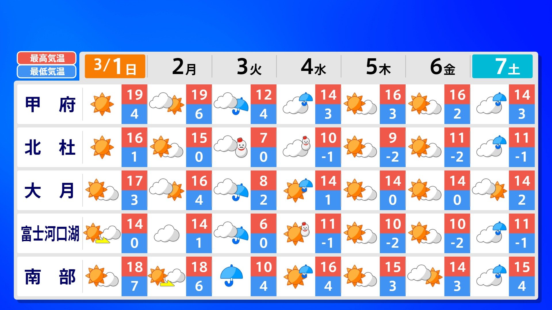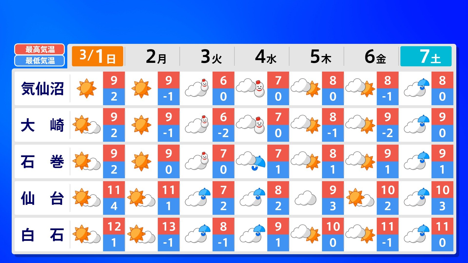 【反時計回りの「渦」】南の海上の「渦」は北上の気配【雨風シミュレーション3月1日(日)~11日(水)】日本は3月3日ごろ「寒の戻り」で雪か? 南日本放送 2026年3月1日(日) 09:00 国内 天気 全国の週間予報(3月1日(日)~7日(土)) 各都道府県の週間予報(7日(土)まで)を画像で掲載しています(各都道府県5か所ずつ)。 3月3日(火)は「寒の戻り」で寒くなるでしょう。東京の予想最高気温は9度と、この土日に比べ10度も下がる見込みです。