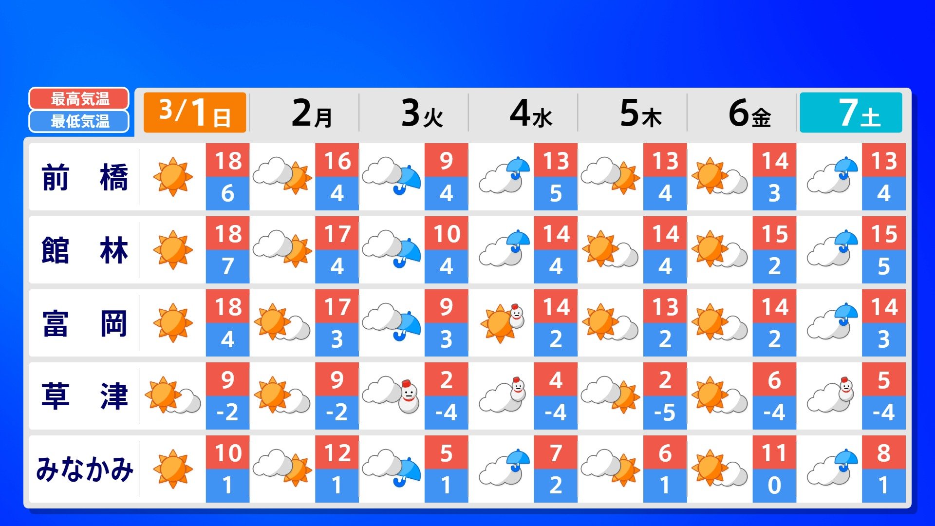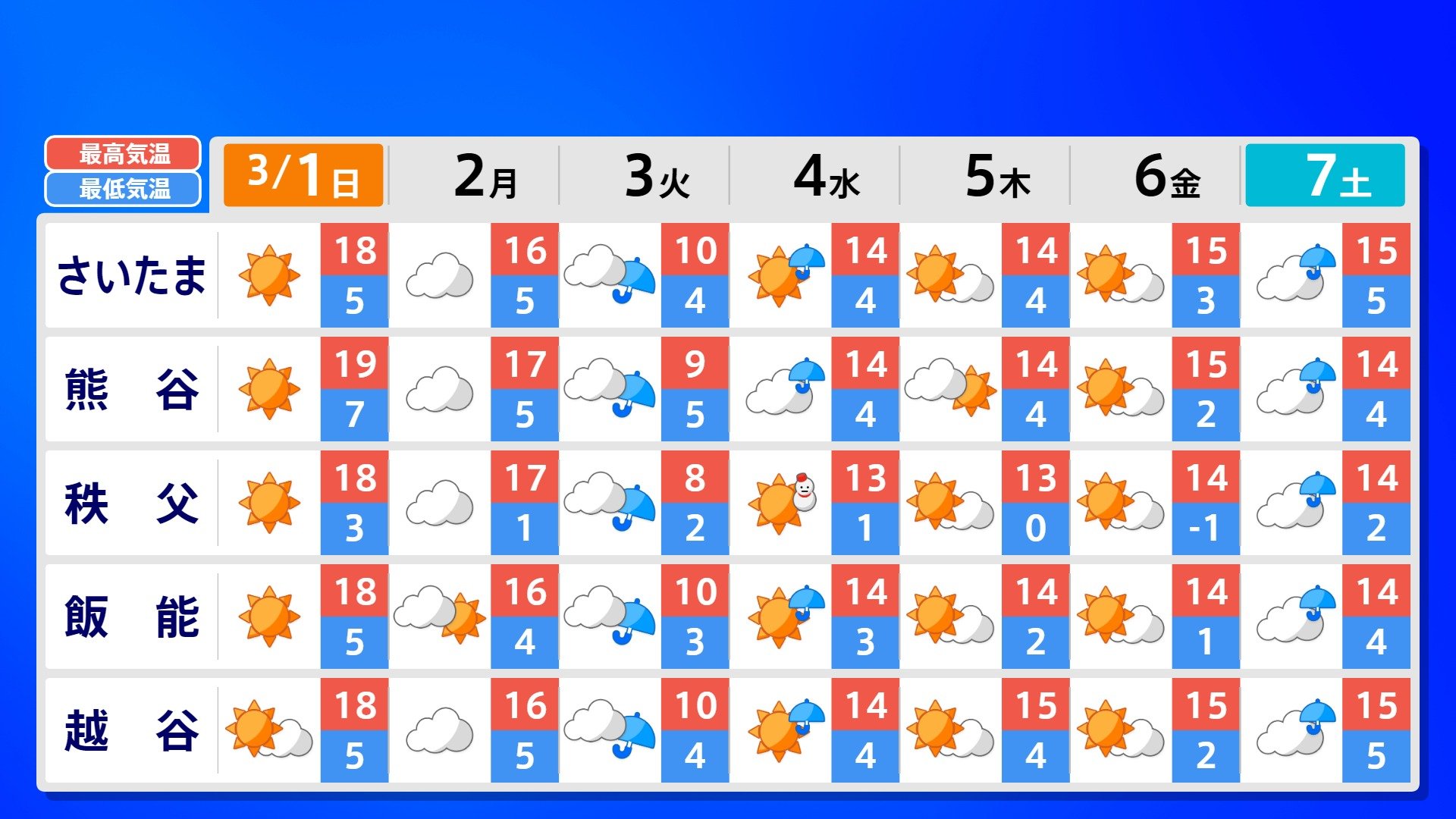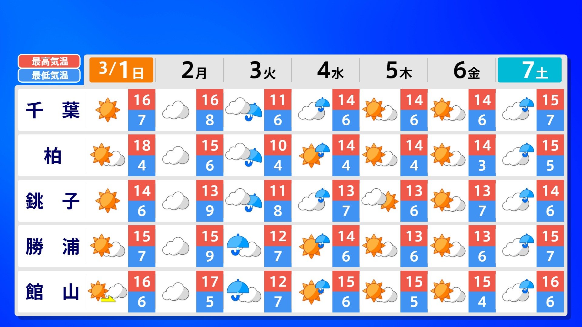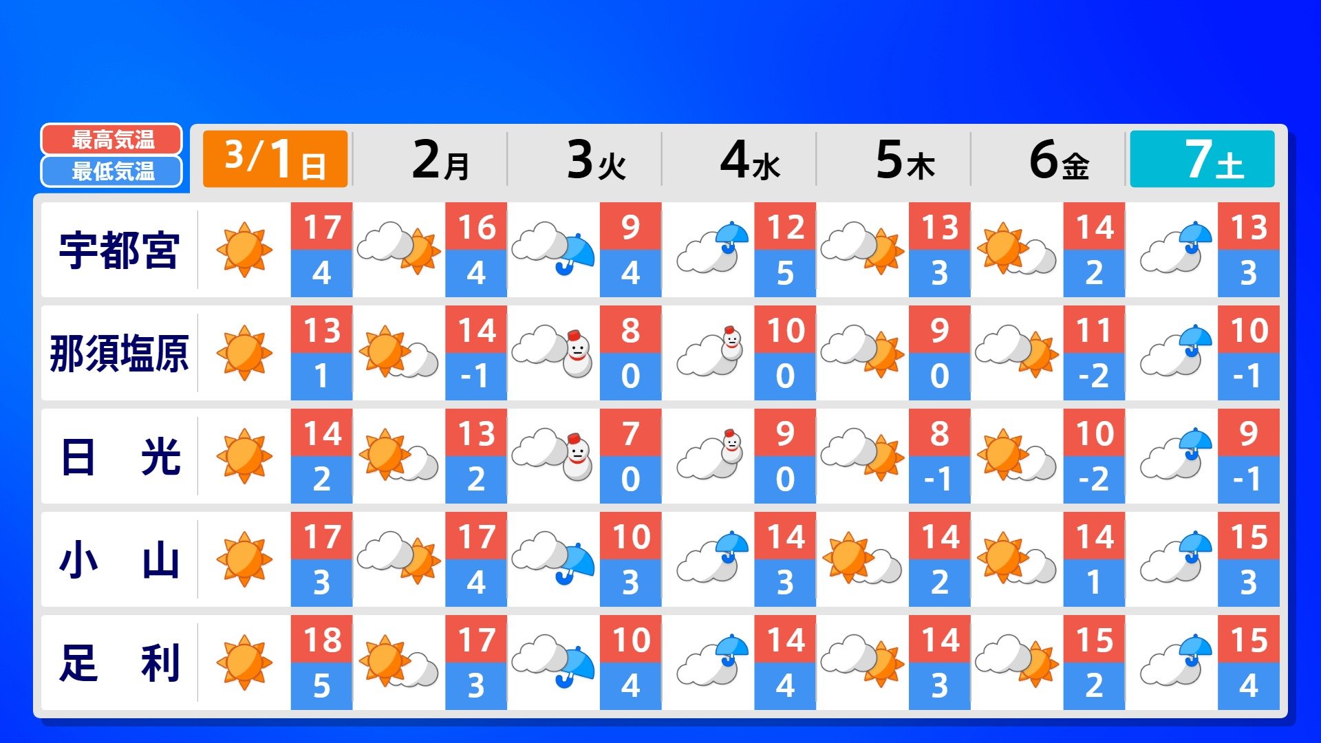 【反時計回りの「渦」】南の海上の「渦」は北上の気配【雨風シミュレーション3月1日(日)~11日(水)】日本は3月3日ごろ「寒の戻り」で雪か? 南日本放送 2026年3月1日(日) 09:00 国内 天気 全国の週間予報(3月1日(日)~7日(土)) 各都道府県の週間予報(7日(土)まで)を画像で掲載しています(各都道府県5か所ずつ)。 3月3日(火)は「寒の戻り」で寒くなるでしょう。東京の予想最高気温は9度と、この土日に比べ10度も下がる見込みです。