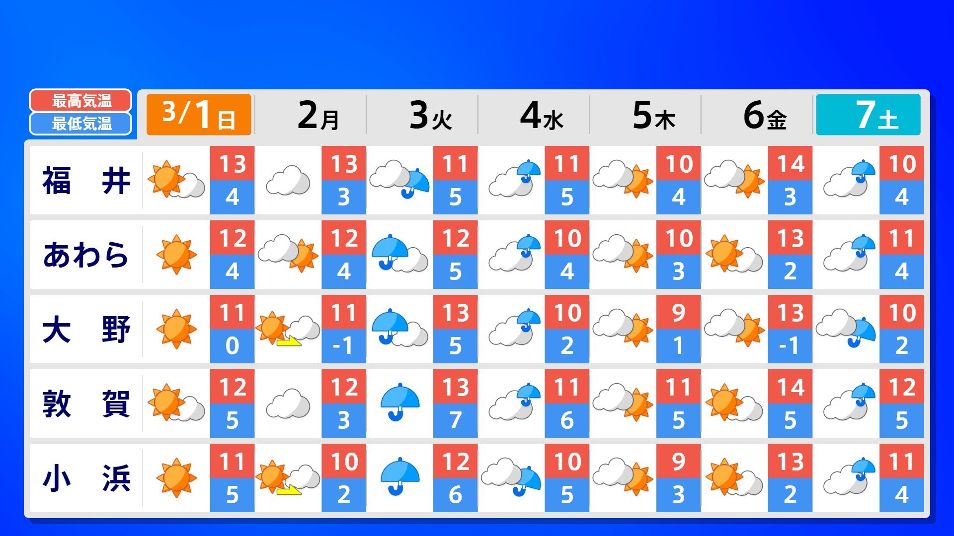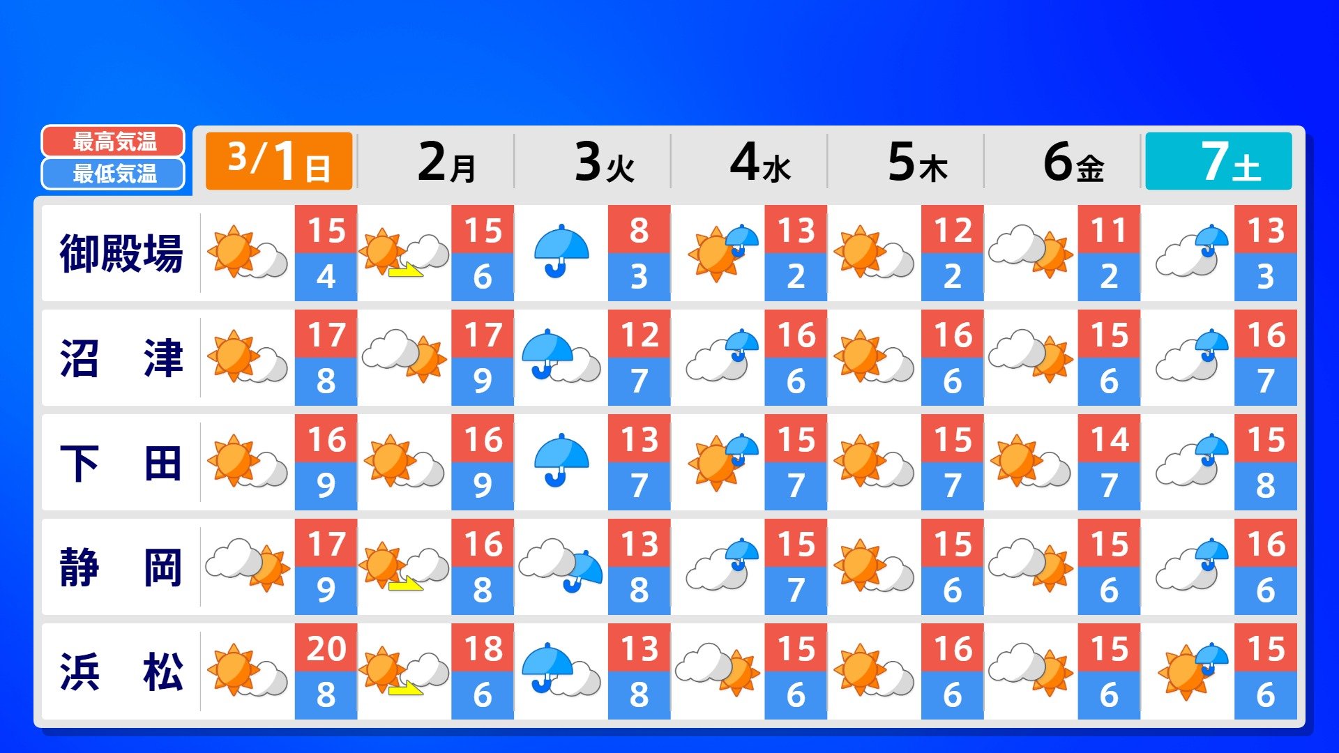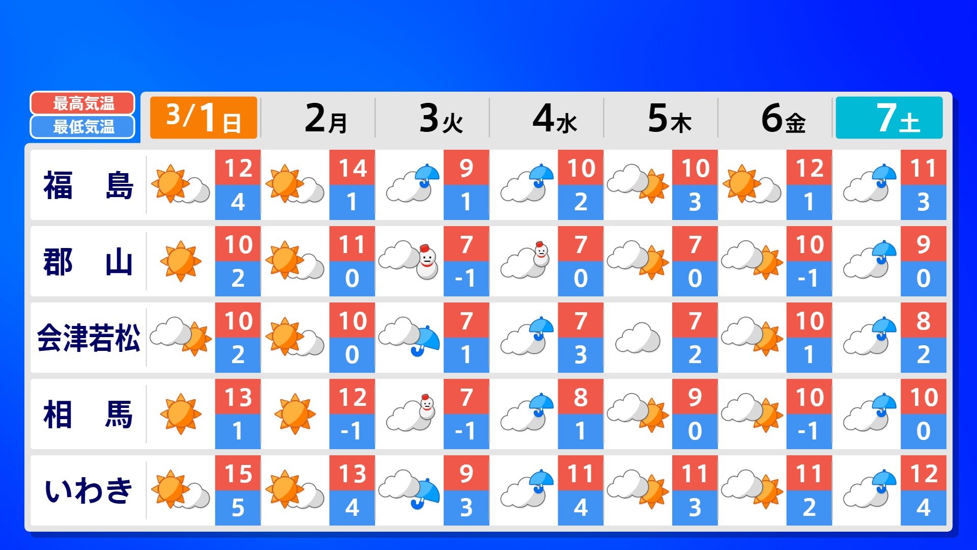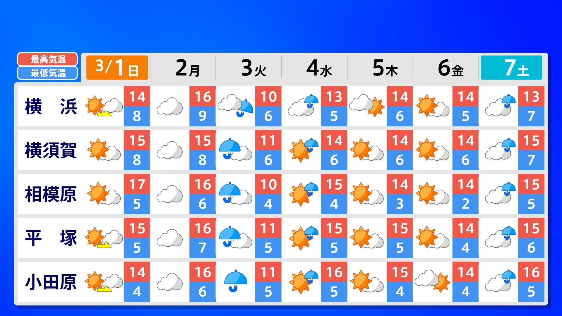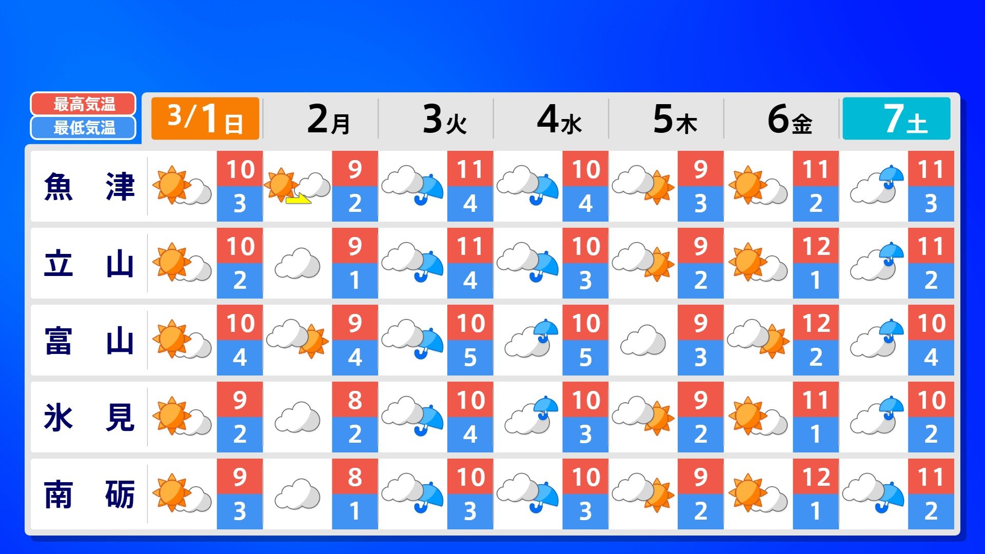 【反時計回りの「渦」】南の海上の「渦」は北上の気配【雨風シミュレーション3月1日(日)~11日(水)】日本は3月3日ごろ「寒の戻り」で雪か? 南日本放送 2026年3月1日(日) 09:00 国内 天気 全国の週間予報(3月1日(日)~7日(土)) 各都道府県の週間予報(7日(土)まで)を画像で掲載しています(各都道府県5か所ずつ)。 3月3日(火)は「寒の戻り」で寒くなるでしょう。東京の予想最高気温は9度と、この土日に比べ10度も下がる見込みです。