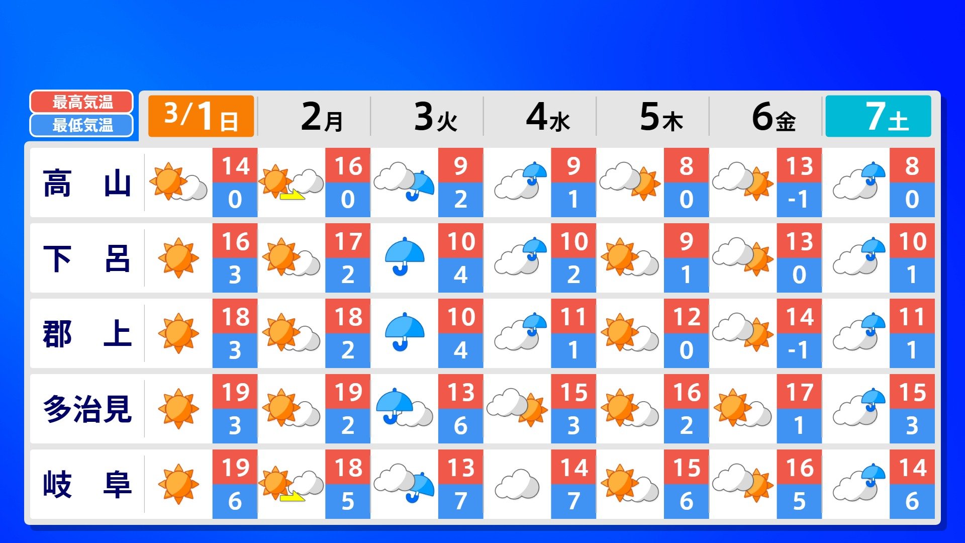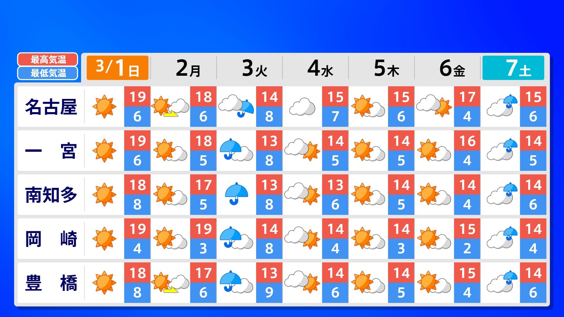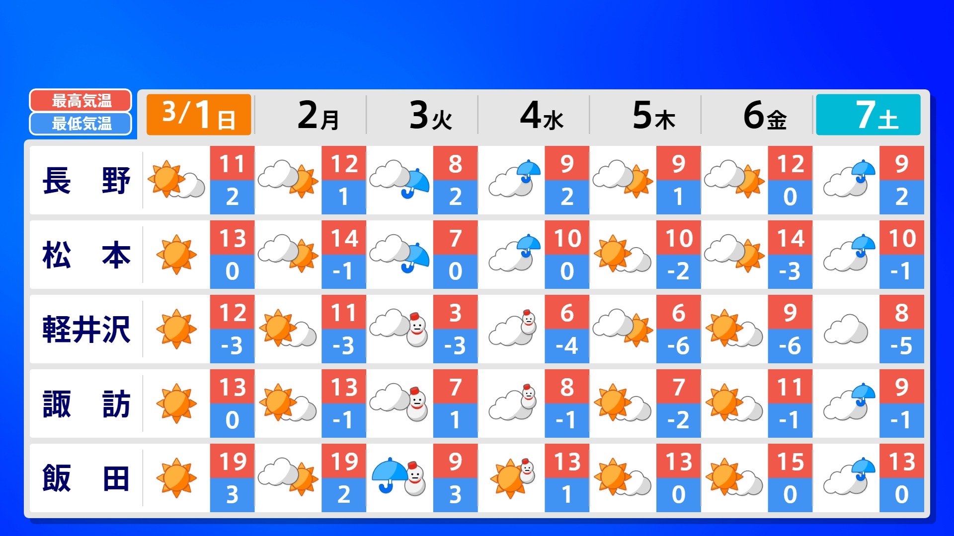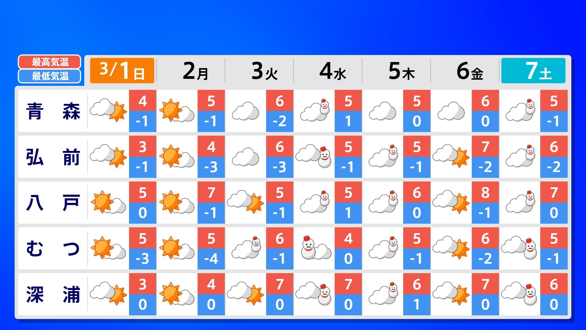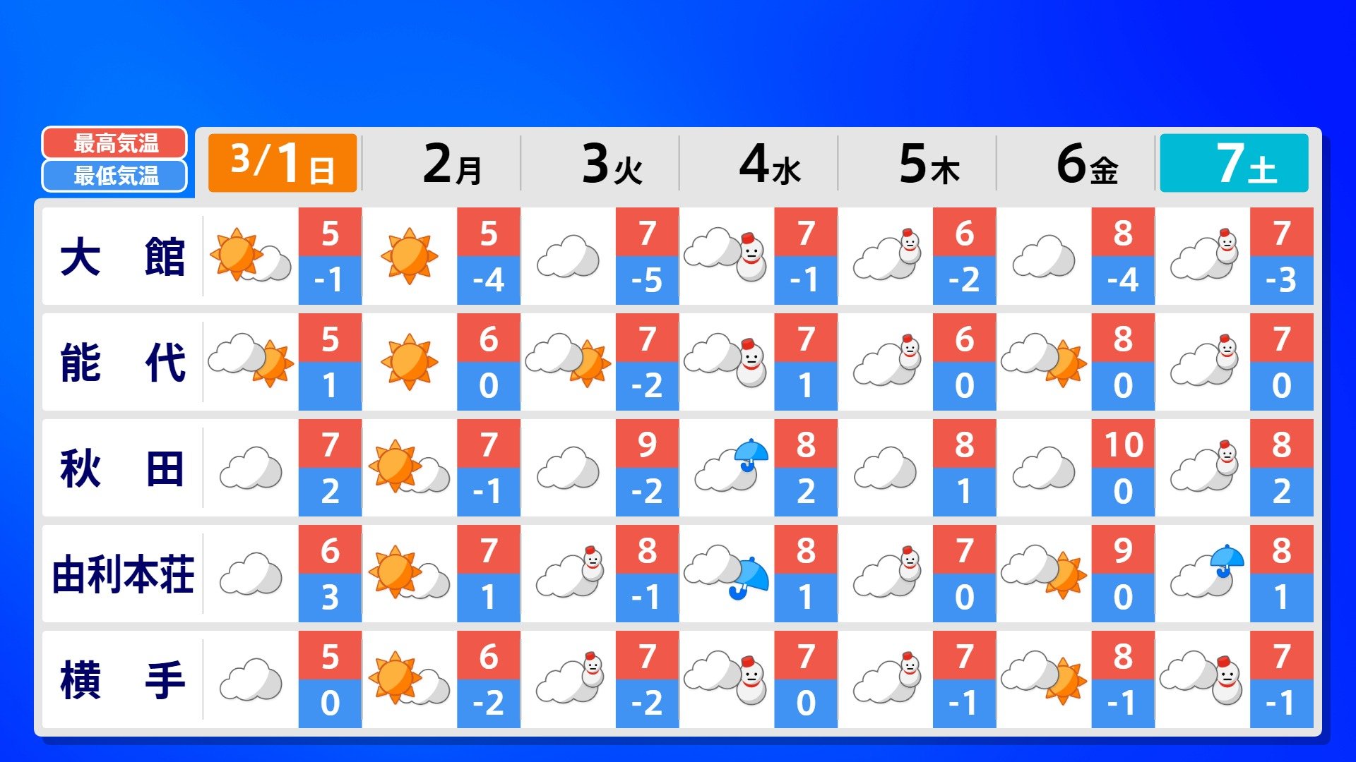 【反時計回りの「渦」】南の海上の「渦」は北上の気配【雨風シミュレーション3月1日(日)~11日(水)】日本は3月3日ごろ「寒の戻り」で雪か? 南日本放送 2026年3月1日(日) 09:00 国内 天気 全国の週間予報(3月1日(日)~7日(土)) 各都道府県の週間予報(7日(土)まで)を画像で掲載しています(各都道府県5か所ずつ)。 3月3日(火)は「寒の戻り」で寒くなるでしょう。東京の予想最高気温は9度と、この土日に比べ10度も下がる見込みです。