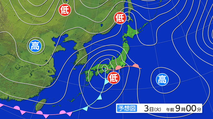 3日ごろには本州の南を進む「低気圧(南岸低気圧)」が北から寒気を南下させ、東京、神奈川、埼玉などでも「雪が降る」可能性が出てきました。