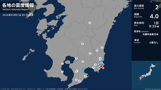 気象庁によると、震源地は大隅半島東方沖で、震源の深さは約50km、地震の規模を示すマグニチュードは4.0と推