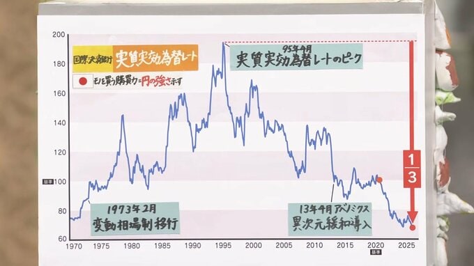 国際決済銀行が発表する「実質実効為替レート」、こちらも日本円でモノを買う購買力、つまり「円の強さ」を示します。こちらのレートでも2026年1月、1973年の変動相場制度になってから最も安い水準になったことがわかりました。