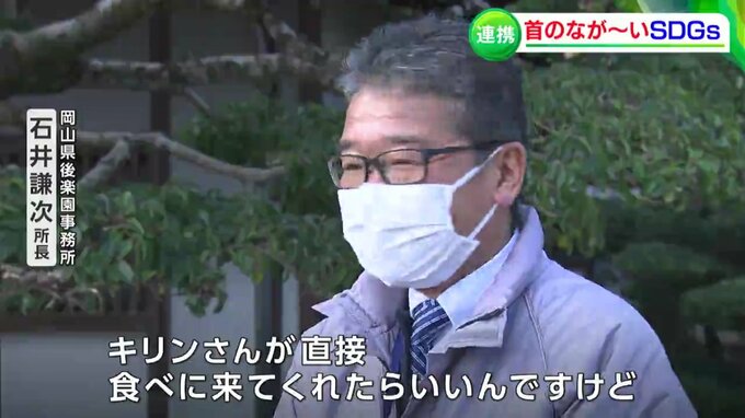 首の長~い動物による、SDGsにつながる取り組みです。岡山後楽園で剪定したクロガネモチの枝葉を有効活用しようと初めて行われた企画です。