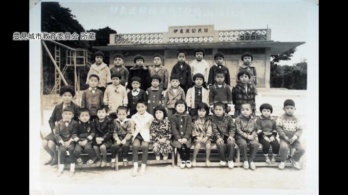 パンとおかずが用意された給食を配膳する列に並ぶ、笑顔いっぱいの子どもたち。公民館を利用して開設されていた幼稚園の集合写真では、みんな一張羅を着けています。展示された写真を眺めていた女性は、古い記憶を思い起こしていました。