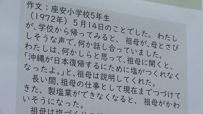 “復帰” 当時の沖縄は、日本の法律が適用されたことで伝統的な製法による塩づくりが禁止されました。作文からはこの影響を受けた家庭の様子が分かります。