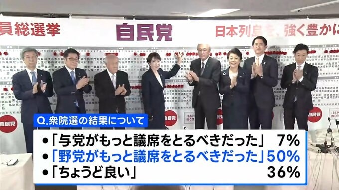 カタログギフト問題 総理の説明「納得できない」54% JNN世論調査 TBSテレビ 2026年3月1日(日) 23:42 国内 衆議院選挙の結果について 先月行われた衆議院選挙で、自民党は単独で3分の2を超える議席を獲得しました。 この結果について、▼「与党がもっと議席をとるべきだった」が7%、▼「野党がもっと議席をとるべきだった」が50%、▼「ちょうど良い」は36%でした。