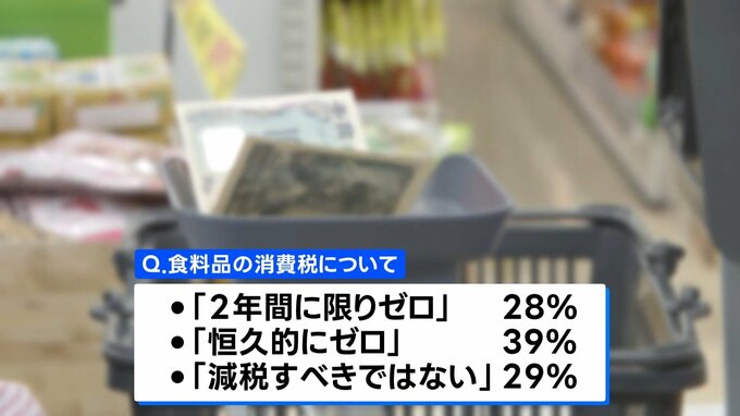 食料品の消費税を今後どうすべきか聞いたところ、▼「2年間に限りゼロ」は28%、▼「恒久的にゼロ」は39%、▼「減税すべきではない」は29%でした。