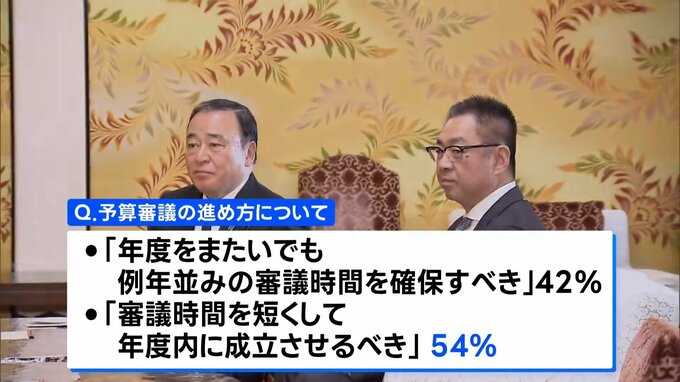 新年度予算案について、与党側は例年より審議時間を短くし今年度内の成立をめざしていますが、予算案の審議の進め方について、▼「審議時間を短くして年度内に成立させるべき」は54%、▼「年度をまたいでも例年並みの審議時間を確保すべき」は42%でした。