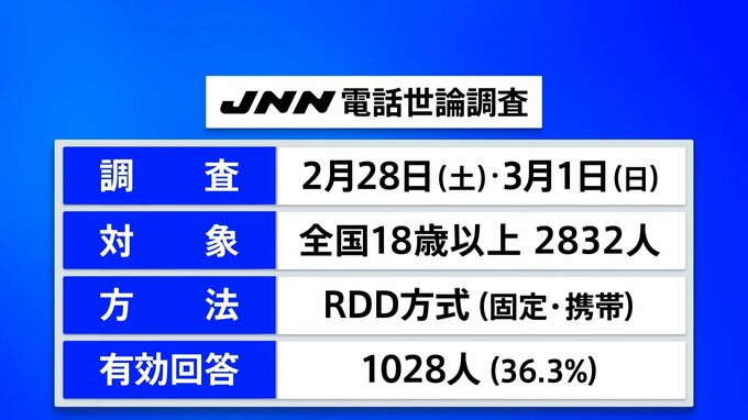 JNNでは、コンピュータで無作為に数字を組み合わせ、固定電話と携帯電話両方をかけて行う「RDD方式」を採用しています。2月28日(土)、3月1日(日)に全国18歳以上の男女2832人〔固定748人、携帯2084人〕に調査を行い、そのうち36.3%にあたる1028人から有効な回答を得ました。その内訳は、固定電話428人、携帯600人でした。