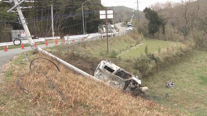 警察官が駆けつけたところ、軽乗用車が道路脇で横転し、全焼した状態で見つかり、車内の運転席側から性別不明の遺体が発見されました。
