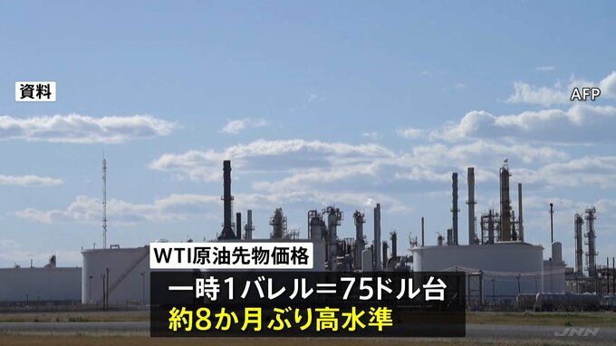 日本時間2日の取引で、WTI先物価格が上昇し、一時1バレルあたり75ドル台をつけました。前週末より12.4%の上昇で、去年6月以来の高い水準です。