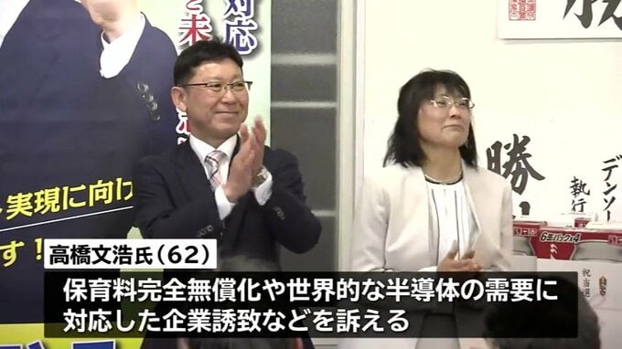 高橋文浩氏は選挙戦で、保育料の完全無償化や世界的な半導体の需要に対応した企業誘致などを訴えました。