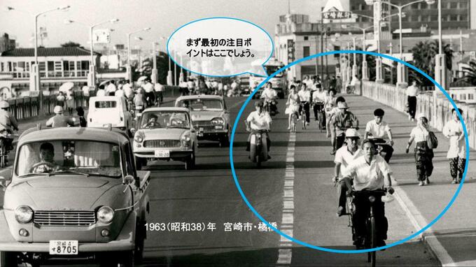 これは最初の東京五輪の前年、1963年の画像です。写っているのは、宮崎県宮崎市、中心地にある「橘橋」の様子です。パッと見てすぐに分かるのは、自転車がすべて車道を走っていること、歩道には歩行者しかいないことでしょう。