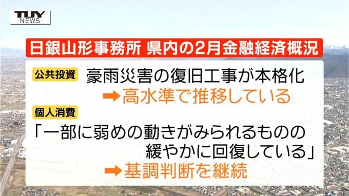 日銀山形事務所によりますと、県内の2月の金融経済概況について、公共投資は、おととし7月の豪雨災害の復旧工事が本格化していることから、「高水準で推移している」と判断しました。