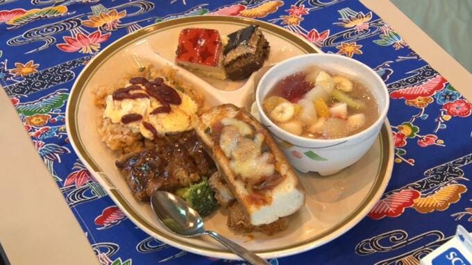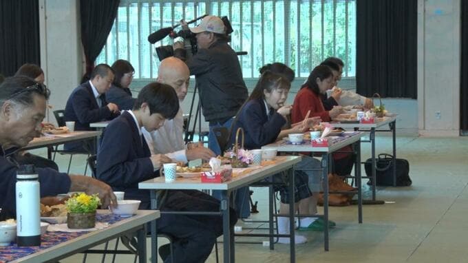 この日の為に用意されたのは、国頭村で捕れたサメのフライやピザトーストなど特別メニューの給食です。生徒たちは思い思いに料理を取り分けたあと、保護者と食事を楽しみました。