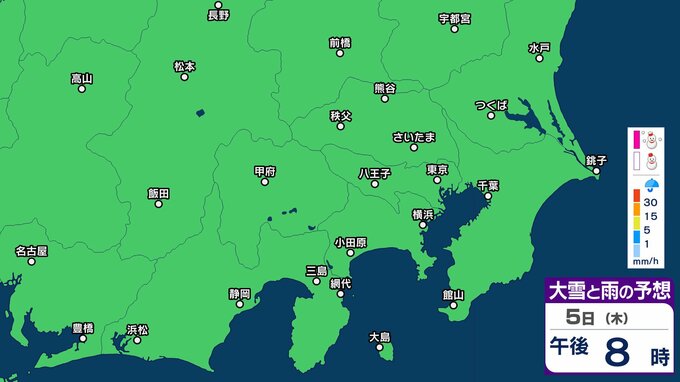 【23区でも積雪か】東京・神奈川・千葉・埼玉・茨城・栃木・群馬・山梨・長野 関東エリア 2日(月)~5日(木)1時間ごとの雪雨シミュレーション【気象庁/2日正午更新】 RSK山陽放送 2026年3月2日(月) 12:27 国内 天気 5日(木)午後 2日(月)~5日(木)1時間ごとの雪雨シミュレーション画像 2日(月)~5日(木)1時間ごとの雪雨シミュレーション画像 ※シミュレーション(GSM)は比較的大まかに雨・雪雲を予想する傾向があるため、局地的には雨・雪が降らないこともあります。予想にはブレ幅がありますので、最新の気象情報を確認してください。
