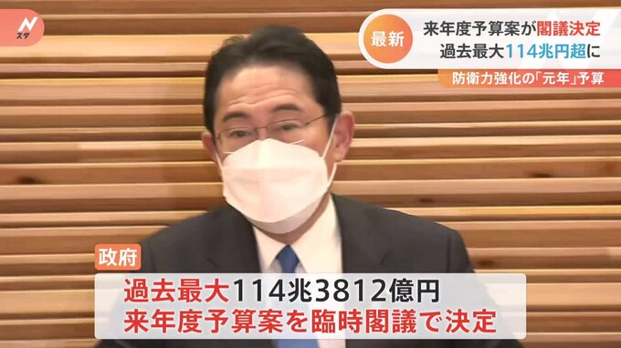 政府は先ほど、一般会計の歳出総額が114兆3812億円と過去最大となった来年度の予算案を閣議決定しました。焦点だった防衛費も大幅増額となりました。先ほど開かれた臨時閣議で決定した過去最大114兆3812億円にも膨…