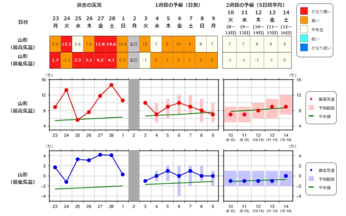 ・最近1週間の実況と今後2週間先までの気温の推移を表示しています。