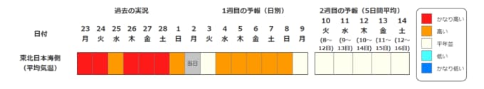 ・2週目の予報は中心の日に前後2日間を加えた5日間の平均(最高気温の5日間平均、最低気温の5日間平均、平均気温の5日間平均)です。平均期間を中心の日の下に表示しています。2週目のかなり高い(かなり低い)は、かなり高い(かなり低い)気温となる確率が30%以上のときに表示します。