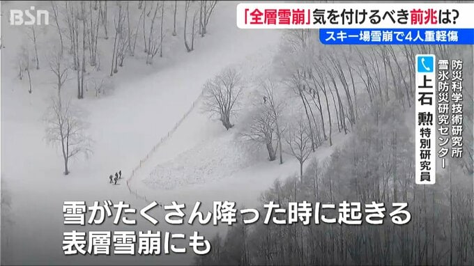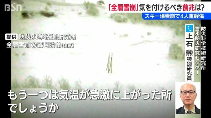 【防災科学技術研究所 雪氷防災研究センター 上石勲 特別研究員】「一般的にはクラックとか雪しわが前兆現象として起こることが多いんですけど、前兆現象がないことも、これも積雪の状況とかいろいろな条件が重なることがあると思うんですけど、(雪崩発生は)あり得ない話ではないかなと」